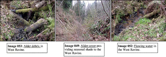 The riparian influence in this forest is minimal, primarily providing topographical complexity and drainage. The stream bank stability is good overall although there is a minor amount of instability where road-cuts have eroded. There is evidence of amphibian presence in downed woody debris surrounding the streams. There are adequate trees for future stream debris, particularly in the West ravine where alder is prolific (Images 53, 52). There is adequate stream shade in the East ravine where mixed conifer and hardwood dominate. The West ravine has a minimal overstory, however various berry species border each side of the stream providing some cover when leafed out (Image 49).