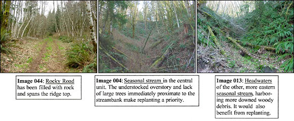 Roads have been cleared with consciousness of erosion and care has been taken to minimize that possibility. Most roads are closed to vehicles during the wet season. Rocky Road, spanning the ridge on the south end of the property, has been filled with rock (Image 44). There is significant natural regeneration in roadcuts. Gates have been installed to keep cattle from entering the majority of the forested area. Western red cedar has been replanted in some areas. Septic systems do not effect the forested area. Woody debris in streams is most comprised of hardwoods, which will decay fairly rapidly.